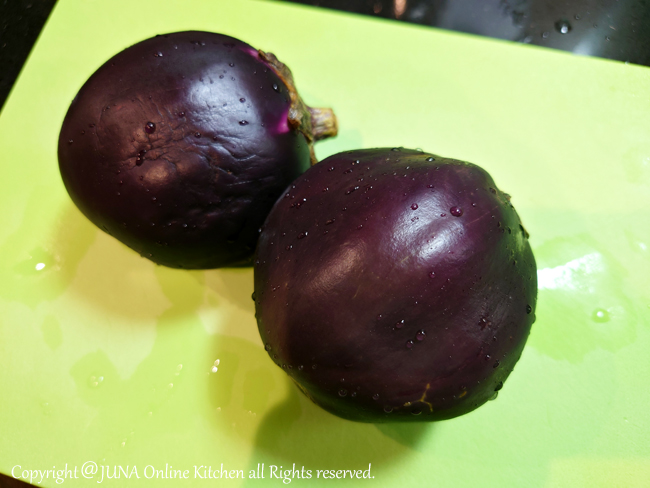 このまん丸のナス!米なすじゃないよ~~だってヘタがなすと同じ色でしょう?(米なすはヘタが緑)これは静岡の特産品として有名な「折戸なす」なので···